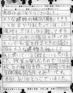 午後一番。野間小学校の先生より、先日の授業に対する子供達の感想文を頂いた。