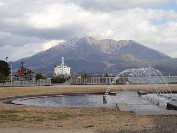 外に出るとシンシンと雪が降り、翌日には雪化粧した桜島を見ることができました。