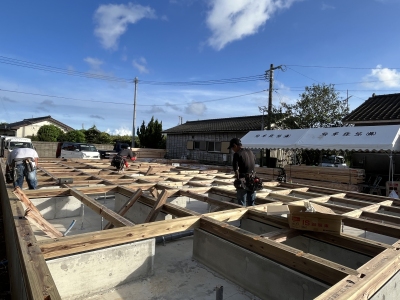 梅雨時期の上棟となったが、幸い雨にあうことなく施工できたヘ(^o^)/