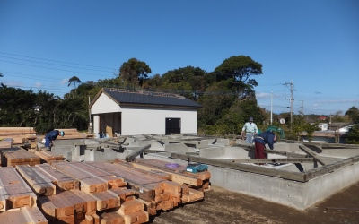 「堂ノ中野の家」は土台敷き込み。19日の棟上げに向けて工事が