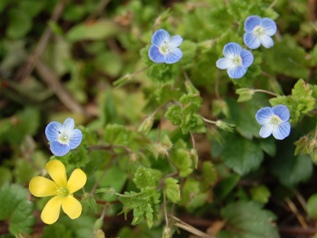 オオイヌノフグリの傍らにカタバミの花が寄り添う。この小さな花を見ると「春の訪れ」を感じる。