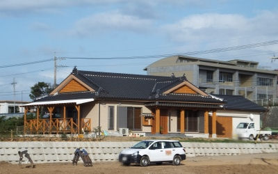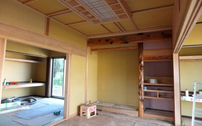 「平松の家」は客間天井、床の間もでき、外構工事に入っていた。