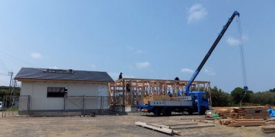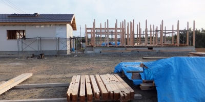 「三俣の家」は棟上げ一日目 今日は躯体が上がり、明日の本棟上げに向けて準備OK