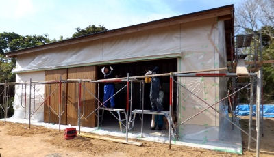 「北阿保の家」は小屋壁の塗装中。左官屋さんが玄関タイル貼りをしていた。