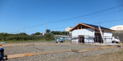 「三俣の家」は倉庫の基礎枠が外されていた。棟上げも近い。