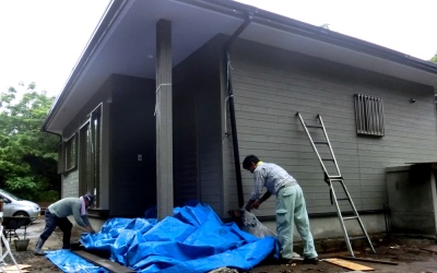 「鎌田の家」玄関タイル貼りの途中 雨続きの日々で左官仕事が大幅に遅れています。