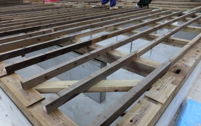 「北阿保の家」土台敷き込みが済み、根太打ち