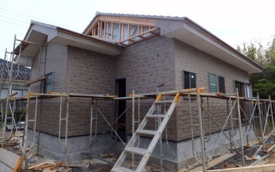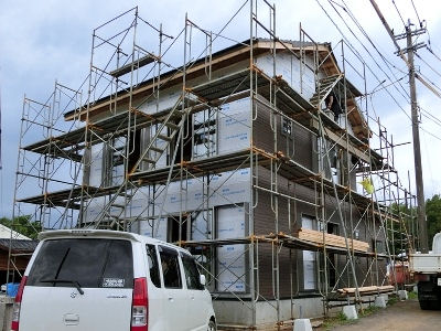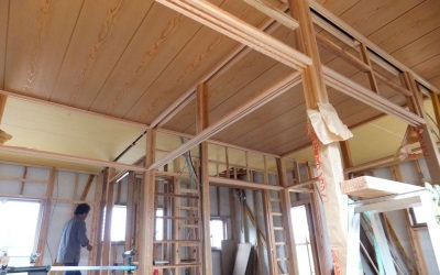 「加例川の家」は屋根の仕上げと外壁張り。内部は内壁の準備に入っている。
