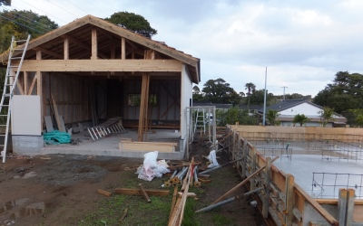 住宅は底盤の生コン打設。外壁の不足分と入口の梁が入荷せず、