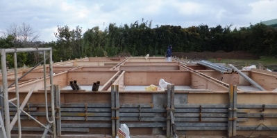 種子島では「堂ノ中野の家」倉庫棟上げ、住宅は配筋中。